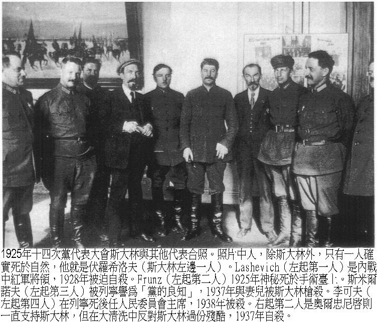 | 中文马克思主义文库 -> 图片馆 -> 【图库】斯大林伪造照相馆 斯大林伪造照相馆 历代的当权者为了巩固其政权,常常会用各种手段捏造及歪曲真实的历史,以达到愚民的效果,方便其统治。这种捏造历史的情况似乎在那些完全不受人民监督,拒绝任何方式的民主政治,却整天自称是代表人民的伪社会主义政权尤其严重。这里要介绍给读者的是一部难得的有关伪造前苏联历史的照片集,整个伪造过程的幕后黑手不是别人,正是在俄国1917年革命退潮中用尽一切阴谋手段去夺得统治权的独裁者史太林。在他掌权期间,不但进行大规模的清洗计划,把知情者及政治上的异己甚至自己的支持者一一从肉体上消灭,同时任意修改保存历史真相的珍贵图片及艺术品,为的是要消灭俄国十月革命的主要领袖(例如托洛茨基)的历史痕迹,同时伪造自己才是主要领袖的记录,为的是创造全国上下对他的个人崇拜。 幸好,历史最终不是按个人的意志行事的,更不容永远被歪曲。经过有心人的搜寻及研究,被埋没几十年的真相终于又再呈现在公众眼前。这本书叫《人民委员突然消失了》(The Commissar Vanishes),副题是史太林时代对照片及艺术的伪造,作者是英国图像历史学者David King。1997年版。 根据作者的介绍,资料的收集工作始于1970他的一次苏联之旅,当时他发现成千上万在史太林政权治下的受害者影像消失了,于是决定找出真相。之后他花了约三十年时间从各种各样的照片、书籍、海报以及印刷品中收集到廿五万份图像,并选出最精彩的部份收录在这图片集里。 读者会从这部精彩的著作中看到,史太林如何利用图片科学的技术来达到他个人的政治目的,把所有不利于巩固他个人权力的历史人物从照片中剔除。他命令官僚用无所不用其极的手段去窜改历史图像。其中包括把照片中的人物用喷漆涂污,删除图片中原有的人物,窜改群众场景等等。本书采用的封面就是其中一幅著名的照片:三名苏共高层干部在不同时期刊登的官方照片中陆续消失,最后只剩下史太林一人!类似的手法在其它地方出现过无数次。他尤其用心去捏造他在革命伊始已是列宁的亲密战友,以及消灭人们对革命第二号领袖人物托洛茨基 (史太林的宿敌,后被史派遣的格别乌杀害) 的记忆,照片中许多领袖人物在史太林手上最后只变成一堆干草,沼泽,耕地,梯级或干脆黑漆一片... 书中所用的部份图片是来自一位出色的前苏联艺术家的个人珍藏,其中有些人物──许多是被史太林认为是异己而遭清洗掉的──的面容都遭深色墨水涂污至难以辨认。