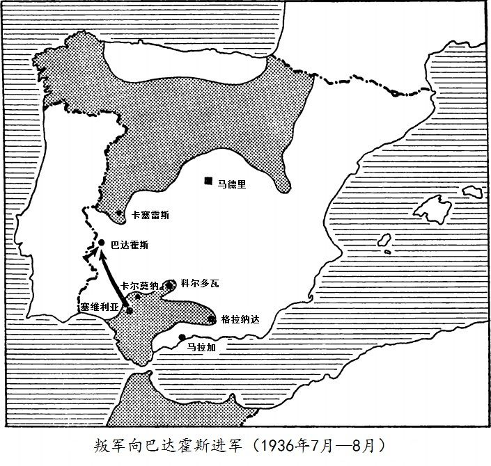 国外报刊上登满了记者的报道,但记者大多是同情叛军的。贝特朗·德·茹夫奈尔在七月二十三日的《巴黎晚报》上发表文章,描写了一位保卫阿尔菲拉(Alfera)的铁路工人,他被埃斯卡梅斯[36]纵队的呼啸兵枪杀[37]。国民军攻占巴达霍斯后,制造了一场真正的大屠杀。阿瓦斯通讯社特派记者发回的电报称,当地大教堂里尸横遍地,就连圣坛上也是触目惊心,“政府支持者的尸体被成排地陈列在大教堂门前的广场上。”《纽约先驱报》(New York Herald)和《时报》的记者描写了这次屠杀,而国民军的军官却以无处容纳战俘来给屠杀开脱。一队难民想逃往葡萄牙边界,他们被带进城里,当场枪杀。据《时报》记者记载,一次就屠杀了一千二百人,“路上血流成河,头盔还在血河上漂浮”,而在广场上,屠杀还在 进行。布拉西亚什承认:“这是非常粗暴的手段,”他还说,“每一个作战人员都被枪杀了,因为只要还没有进行总动员,他就会被当成激进分子。[38]”