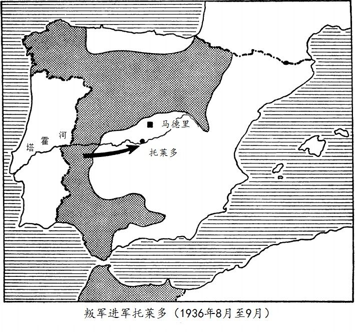 九月初,在德国和意大利的大力支持下,双方的力量对比发生了剧烈的变化,大部分观察家都认为马德里将会迅速沦陷:民兵看来是打不过职业军人、坦克和飞机的。但是原定的进攻却被推迟了。弗朗哥必须分兵增援北方,所以他谨慎地推迟了进攻:他似乎打算先集中充足的兵力,再发动致命的一击。但更重要的是,还有一个心理因素也对军事行动产生了影响。从八月初开始,国民军的报纸和同情叛乱的外国报纸就在齐声盛赞托莱多军事学院的学员。其实,在阿尔卡萨尔要塞的守军中只有几个军校学员[25]。但是,国民警卫队的英勇抵抗,在宣传中被安到了学员头上,于是,他们便成了抵抗“赤色”统治的西班牙青年的象征,“阿尔卡萨尔的学员”的神话就这样炮制出来了[26]。卡巴耶洛政府成立时,围攻阿尔卡萨尔城堡的一方加强了进攻:炮弹把建筑物轰成了瓦砾。国民警卫队仍在城堡的地下室内坚守。但他们的补给即将用完,饮用水已经不够用了[27]。弗朗哥拒绝进军马德里,准备解救阿尔卡萨尔[28]。他的部队沿着塔霍(Tajo)河谷,从南方进攻。九月四日,雅古埃上校的摩洛哥先遣队进入了塔拉维拉·德·拉·雷纳(Talavera de la Reina)。