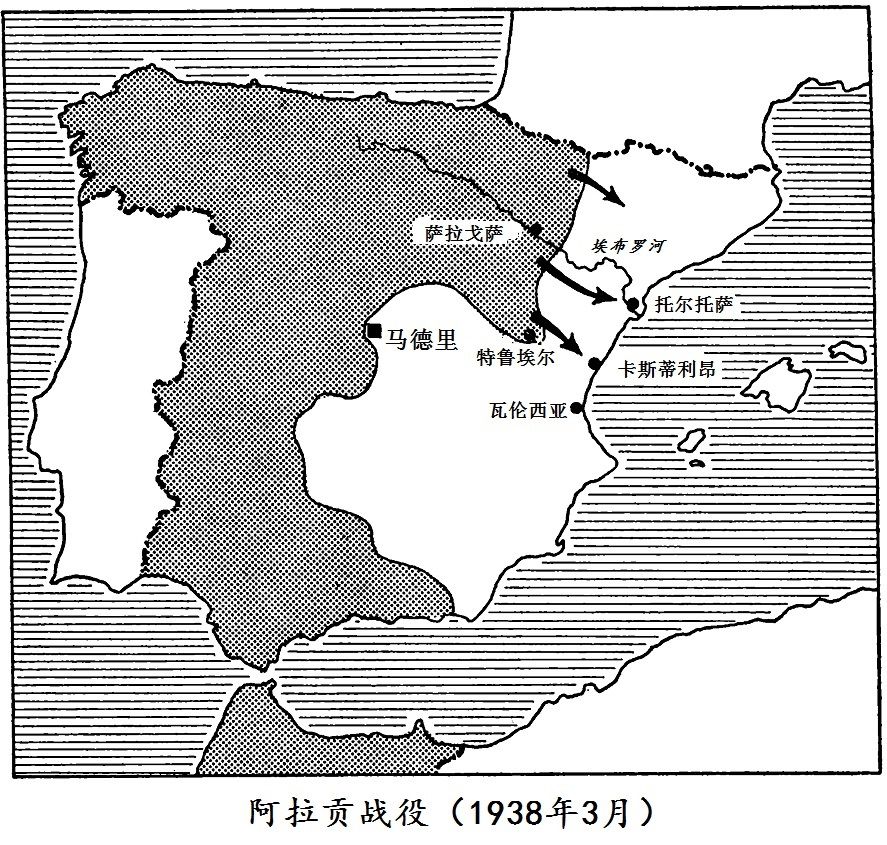 不过,叛军首先需要打退共和军的新一轮进攻,这次进攻从一月二十五日持续到了三十日,但没有取得任何成果。然后需要集中兵力,在阿尔范布拉河以西突破共和军的防线,并消灭据守在帕洛梅拉山脉(Sierra Palomera)上的共和军;共和军在去年十二月就是从那里发动进攻并赢得了胜利的。但国民军司令部的野心还不止于此。它还打算继续向东推进,从侧翼包抄特鲁埃尔与北面的共和军。最后,在反攻期间,它准备让第二十三军在该地区实行一次钳形进攻。这次进攻将在国民军阵地的两端发动:在北面,由雅古埃指挥的摩洛哥军,将在纳瓦拉师的支援下,沿着比维尔·德尔·里奥(Viver del Rio)进攻。在南面,加利西亚军在得到穆尼奥斯·格兰德斯[18]的第一百五十师加强后,将突破特鲁埃尔与塞拉多斯(Celados)之间的山地地带,并渡过阿尔范布拉河。战线的中段是最薄弱的,驻守中段的是莫纳斯特里奥上校的第一骑兵师。