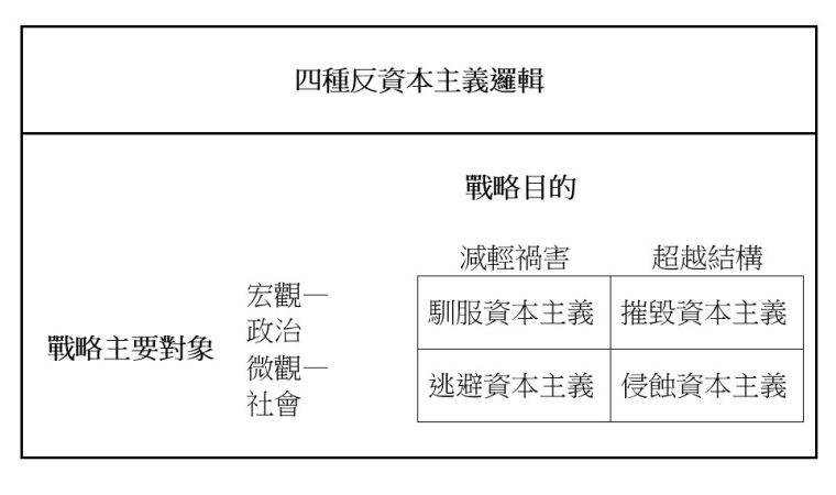 历史上,反资本主义由四种截然不同的反抗逻辑带动:摧毁(smashing)资本主义﹑驯服(taming)资本主义﹑逃避(escaping)资本主义,以及侵蚀(eroding)资本主义。