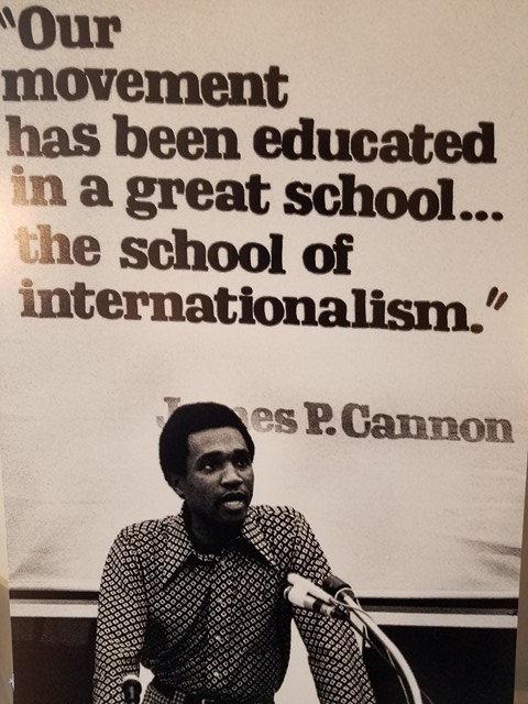照片:2008年夸梅·桑布鲁在列昂·托洛茨基遗产问题会议(Conference on the Legacy of Leon Trotsky)上发言。背景中的壁画由迈克·阿列维茨(Mike Alewitz)创作。