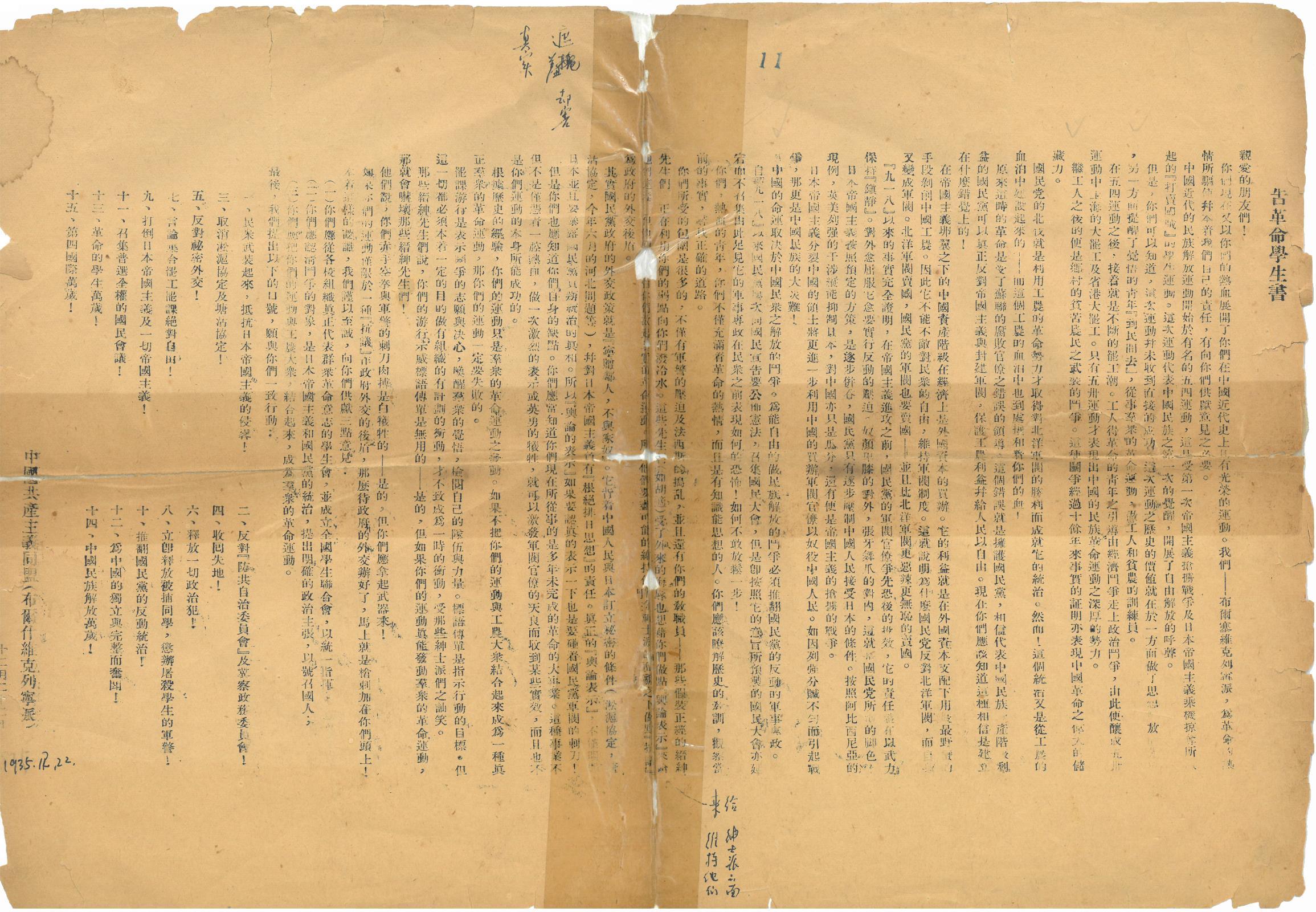 你们所受的包围是很多的,不仅有军警的压迫及法西斯的捣乱,并且还有你们的教职员——那些假装正经的缙绅先生们,正在利用你们的弱点向你们泼冷水。这些先生们(如胡适)受了外来的侮辱也想借你们做点『舆论表示』来给□□□□〔他们遮羞〕。但他们□□激起□〔真〕实的革命运动。所以他们要尽可能的维持绅士派的面貌之下做点『抗议』为政府的外交后盾。