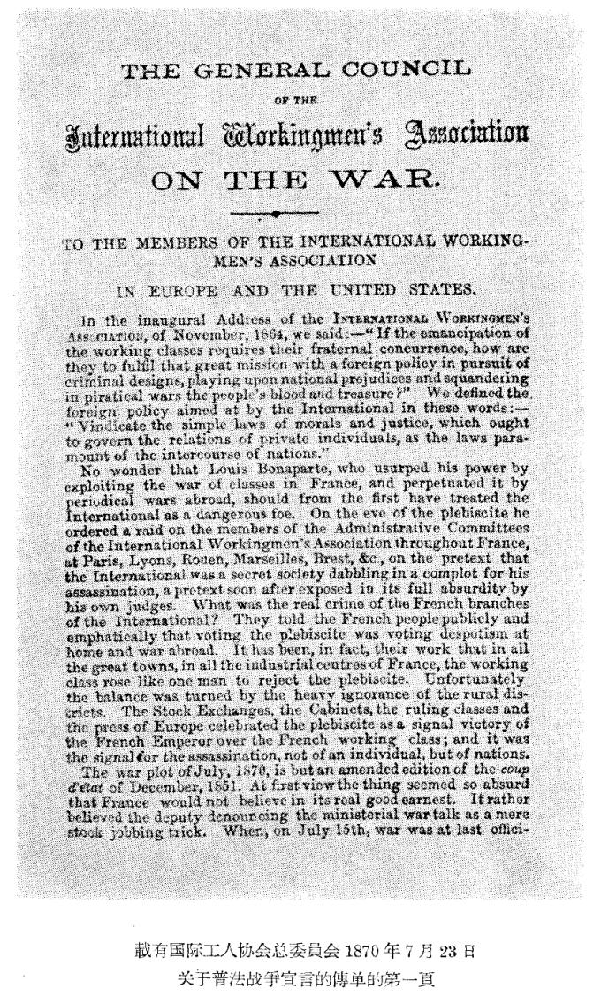 载有国际工人协会总委员会1870年7月23日关于普法战争宣言的传单的第一页………………………………………2—3