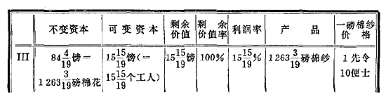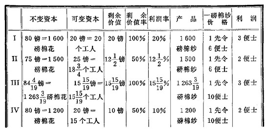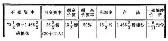 | 不变资本 | 可变资本 | 剩余价值 | 剩余价值率 | 利润率 | 产品 | 一磅棉纱价格 | |