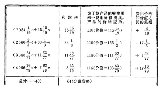 这里我们可以看到:具有平均构成的资本100镑生产的商品,其费用价格是115+(15/19)镑,而不是以前的110镑。[单位]商品的平均价格会不会因此而提高呢?