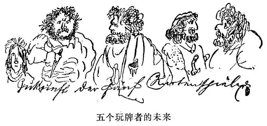 Et tu,Brute?Friderice Graeber,hoc est res quam nunquam de te crediderim!Tu jocas ad cartas?passionaliter?O Tempores,o moria!Res dignissima memoria!Unde est tua gloria?Wo ist Dein Ruhm und Dein Christentum?Est itum ad Diabolum!Quis est,qui te seduxit?Nonne verbum meum fruxit(hat gefruchtet)?O fili mi,verte,sonst schlag ich Dich mit Rute und Gerte,cartas abandona,fac multa bona,et vitam agas integram,partem recuperabis optimam!Vides amorem meum,ut spiritum faulenzendeum egi ad linguam latinam et dic obstupatus:quinam fecit Angelum ita tollum,nonsensitatis vollum,plenum et,plus ancora viel:hoc fecit enorme Kartenspiel![注:还有你,布鲁土斯?弗里德里希·格雷培,我从来没有料到你会干这种事!你在玩牌?上瘾了?哦,时代,哦,风尚!最有价值的事是记取教训啊!你的名声何在,你对基督教的信仰何在?都见鬼去吧!是谁把你引入歧途?难道我的话不管用?啊,我的孩子,回心转意吧,否则,我将用鞭子抽你;把牌放下,多做好事,过纯洁的生活吧,那时你将会赢回幸福!我的爱好已经使我懒散的精神转向学习拉丁语,你看到我这种爱好,会吃惊地说,是谁使安琪儿如此怒不可遏?是谁使他头脑里充满愚蠢的想法和其他荒唐的东西?这是漫无节制的牌戏造成的!(信的这一部分是用拉丁文写的,中间插进了一些德文词句,为了押韵起见,某些德文字的词尾是故意写错的。)——编者注]自己好好想想吧,干坏事的人,想一想你生活的目的是什么!强盗,想一想你在各个方面都在犯罪,不知好歹!纸牌!这是用魔鬼的皮做的。啊,你们这些恶棍!一想到你们我就眼泪汪汪,或者说痛心疾首!哎呀,我身上充满了灵感啦!在1839年第二个月的第十九天,正午时分,因为通常十二点钟用午饭,一阵旋风将我卷起,带向远方,那里我看到他们正在玩牌,而这时正是吃午饭的时候。牌还得继续打下去。这时从东方刮起了一场可怕的雷暴雨,窗玻璃嘎嘎作响,冰雹纷纷落下,可是他们仍然继续玩牌。后来玩得争吵起来了。东方的国王杀向西方的大公,午夜里又是格斗者的一片厮杀声,接着大海的公爵又起来反对东方诸国,于是一场人类空前的大决战就在他的城市前面爆发了。然而,他们还是继续玩牌。终于从天上降下七个神灵。第一个神灵身穿长礼服,他的胡子垂到胸前。他们称他浮士德。第二个神灵的秃顶周围长着一圈白发,他扬言:“哀哉,哀哉,哀哉!”他们叫他李尔。第三个神灵是个高个子,力气很大,他的名字叫华伦斯坦。第四个神灵象亚衲族人的后裔,拿着一根黎巴嫩雪松般的大棒。他们叫他海格立斯。第五个神灵混身如铁打钢铸,他的名字写在他的前额上:齐格弗里特。和他并行的是个强壮的勇士,他的宝剑犹如闪电闪烁着光芒,这是第六个神灵,他叫罗兰。第七个神灵身佩宝剑,把系在剑梢上的头巾当作旗帜在头上挥舞,旗帜上写着:Mio Cid[注:我是西得。——编者注]。这七个神灵敲了敲玩牌者的门,可是他们不予理睬。终于从午夜里走来了伟大的黎明,它象雄鹰一般掠过整个大地,飞向远方,当它消失的时候,我就再也看不到玩牌者了。但门上画了几个黑色的符号:[注:柏林!——编者注]。我愣住了。