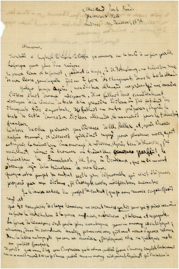 此外,我没有凯勒先生的地址。等我最终找到他之后,他写信告诉我,几个月来他都忙于翻译一部医学著作。经过多次尝试,我现在终于找到了理想的译者,即波尔多的鲁瓦[3]先生。他是费尔巴哈的译者,现在已经开始翻译我的书了。