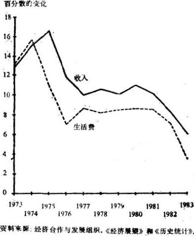 1973年以后,积累速度和生产率增长速度减慢,导致生活水平提高的速度也减慢。尽管1974—1975年工资在产值中所占的比重大幅度地提高了(从另一方面来说,是利润减少了),但工人实得的税后收入在那几年中的增长速度只有先前年份的一半(这是因为总产量在下降)。这种低速增长的局面在其后的年份还继续存在。