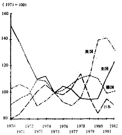 1973年固定汇率制度的崩溃(见第十二章)并不象人们有时断言的那样对贸易产生了灾难性的后果。尽管有政府试图抚平“骚动的市场”的干涉,主要货币之间的汇率至今为止却一直在天天相当大幅度地波动着。不过这些波动——以美元和马克之间的汇率为例,平均每天为0.5%——在阻碍贸易方面被认为只有微小的影响。较为严重的问题倒是从一年到另一年的汇率变动倾向完全未能够消除各国之间通货膨胀率的差别。以相对单位劳动成本计算的实际竞争程度有很大的变化(见图16•3)。从1973年以来美国、日本和德国年与年之间的经常性项目差额在(+)100—150亿美元到(-)100—150亿美元的范围内浮动。与美元相比,日元和马克都升值了,前者一直维持到1979年,后者则维持到1980年,升值幅度大大高于有据可查的它们的成本增加的低速度。1978年之后,特别是在里根的紧缩通货政策指导下,美元急剧增值了。所以,到1982年时这三个国家的相对单位劳动成本回复到了1973年的情况。此外,将这个时期作为一个整体来看,那些涨落似乎己抵消了。1974年到1981年间美国平均每年的经常项目顺差为2.5亿美元,日本为12.5亿美元,德国则收支平衡。