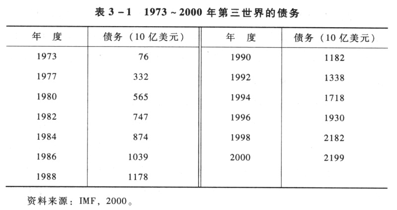 如果说民族国家体系之外的货币资本的积累是经济全球化进程的一个重要方面,那它也是将国家,尤其是外围国家纳入跨国化进程,或者更普遍地说是将福利主义和发展主义国家转变为新自由主义国家的一个关键性机制。20世纪80年代和90年代的债务危机(见表3-1)将全球资本主义的权力和权威强加到了第三世界民族国家的结构和功能之上。债务迫使全世界的国家和地区重新融人一个经过改组的全球经济之中。70年代,循环性流动资本大规模涌人第三世界,加上跨国金融资本的经济权力的集中化,从而对外围地区现存的集团和阶级集群产生了深刻的影响。赚取外汇来偿还债务的需求(跨国资本对债务国的结构性权力,以及来自核心民族国家的直接压力强迫债务国偿还债务)迫使债务国对其经济结构作出有利于出口方面的调整,从而与变动中的世界市场需求结构保持一致。一段时期以后,债务缩减和紧随其后的储备增加加强了那些本地经济结构中外向型部门的实力,重新分配了积累性政治权力和经济权力的比例,增加了与跨国资本相关的新的分支的份额。