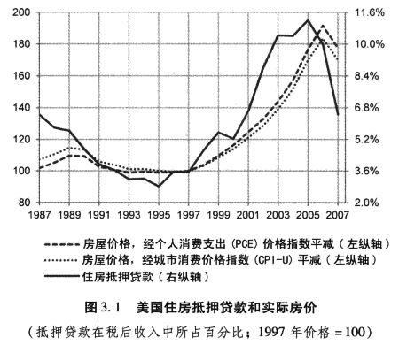 次级贷款的增长不可能是抵押贷款需求暴涨的主要原因,这是因为2003年之前的每一年,次级抵押贷款都只占全部抵押贷款的8%或更少(旧金山联邦储备银行,2007:8,图1)。自2004年到2006年,次级贷款的比重接近20%,但抵押贷款占收入的比重在那时已经不再上升(见图3.1)。