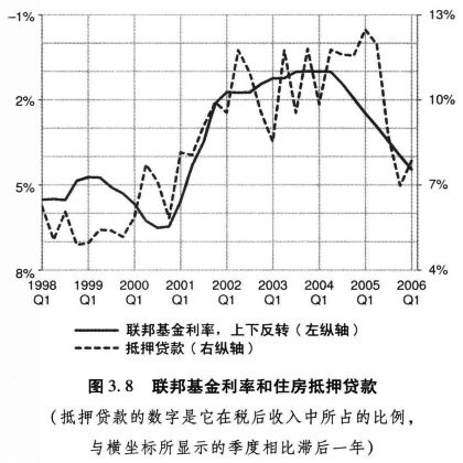 作为对联邦基金利率下调的回应,包括抵押贷款利率在内的其他利率都在降低。不断降低的抵押贷款利率使抵押贷款的数量激增。图3.8显示了联邦基金利率与滞后一年抵押贷款(用它占税后收入的百分比表示)两者之间的紧密联系。因为两者是反向变动的,所以我将联邦基金利率的纵坐标上下反转,以使这种紧密联系表示得更加明显。在图中所显示的时期中,平均来看,联邦基金利率的一个百分点的下降(或上升),会导致借款/收入比率略大于一个百分点的上升(或下降),联邦基金利率的变动解释了借款/收入比率的三分之二的变动。[17]