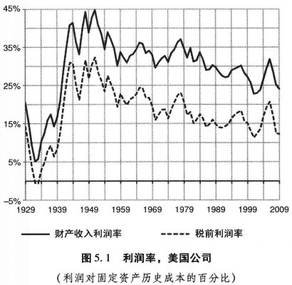 我的利润和利润率数据涉及美国经济的全部公司部门;因此,它们既包括金融公司的利润,也包括非金融公司的利润。本节后面,我将讨论美国跨国公司对外投资的盈利能力,但除非另有说明,我的分析只涉及被BEA称做的“国内的”公司。(因为这两组数据严格说来不可比较,它们需要分开来讨论。)国内数据包括总部设在外国的公司(foreign-based corporations)从它们在美国的运营中获得的利润和它们位于美国的固定资产,但排除总部设在美国的公司(U. S.-based corporations)来自于国外的利润和它们位于国外的固定资产。因此,我所说的“美国公司(U. S.corporations)”,应当被理解为一个地理概念,它指的不是公司的“国籍”。