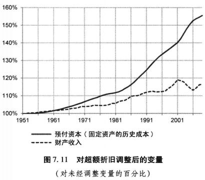 图7.11显示了这种调整如何影响这两个变量。与经调整的财产收入衡量相比,经调整的预付资本衡量增长了更大的百分比,这是因为,如上面所强调的那样,额外折旧以累计的方式永久地降低了预付资本而不是利润。