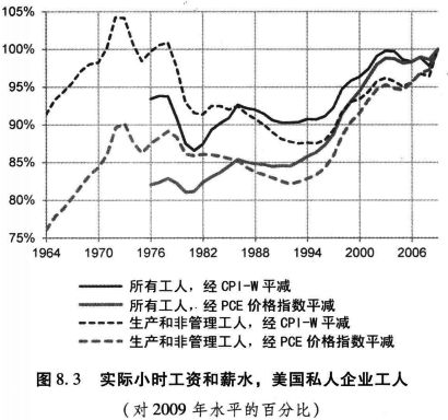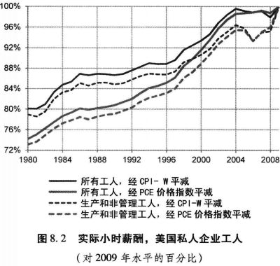 图8.2清楚地表明,实际小时总薪酬显著上升而不是下降,生产和非管理工人实际薪酬的上升始终在平均水平之上。当我们使用PCE价格指数对通货膨胀进行调整时,我们发现他们的薪酬在1980至2009年间上升了37%,而所有工人的薪酬上升了35%。当我们用CPI-W对通货膨胀进行调整时,我们发现生产和非管理工人的薪酬上升了27%,而所有工人的薪酬上升了25%。