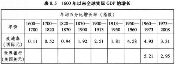 最后的两句话,即提到“无限扩张的市场”和“滚雪球式的扩张”的那两句话,无疑预先假定了所讨论的增长过程必然是爆炸式的,而它已被证明是错误的。对于第一句,有非常好的理由“假定”加速增长曾经发生过。表8.5提供了对全球实际GDP自1600年以来的增长率的估计,它是在已故的安格斯·麦迪森和世界银行公布的数据基础上计算的。[16]这个表格提出了极强的证据,证明了实际GDP增长的加速是整个世界在近4个世纪以来的常规现象。到1973年为止,除了1913至1950年这个经历了大萧条和两次世界大战的时期以外,平均增长率一直持续上升。