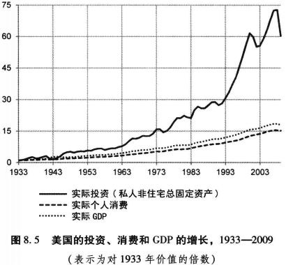 图8.5 美国的投资、消费和GDP的增长,1933—2009