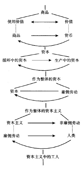 在这种对立中,我们理解到支撑反抗资本的斗争并推动着〔207〕超越资本主义的是工人自身和他的生活条件之间的矛盾。(资本和雇佣劳动之间的对立仍然存在——因为只要雇佣劳动还只是雇佣劳动,它跟资本就是对立统一的)因此,正如在图11.2中所看到的那样,从商品开始的剥削以人类内部的矛盾而结束,而后者已经隐含在商品的使用价值和价值之中了。