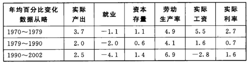 私有化最频繁的部门是公用事业和英国天然气公司以及电力、自来水等部门。它们的私有化发生于1986年(英国天然气)到20世纪90年代早期(电力部门)期间,为私有化过程中谁获益、谁受损提供了一个有趣的例子。表2.2给出了这些部门资本和劳动力投入、生产率的提高及工资、利益等变化情况。第一个时期是1970年~1979年间,包括工党执政的那几年;第二个时期是1979年~1990年间,包括撒切尔政府对工业的逐步重组以及私有化之前通过政府颁布财政目标的方式提高效率的企图,最后一个时期是1990年~2002年间,这贯穿了三大部门全部被私有化及其监管体制确定、运行的那些年份。
