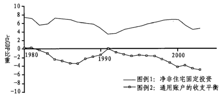 图4.3 美国的经常账户与国内投资(1980~2003)