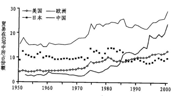 中国一批又一批的出口商品出现在发达国家的市场上,有力地体现了中国日益与世界经济的一体化。这部分作为一个前奏,先讨论经济受到国际性竞争化影响的程度,下一章再讨论国际性竞争是否破坏了市场规则和平等的政策。资本循环在最后一章讨论,这一节主要讲述国际贸易、外国直接投资(FDI)的流动和国际移民[1]。