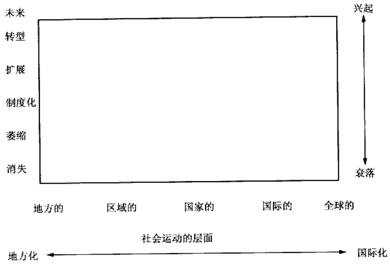 图7. 1有两条轴线。一条轴线表示由盛及衰,另一条轴线表示由地方而至全球。图中“全球的”代表了这样一种可能性,也就是超国界行动主义的鼓吹者所认为的,不仅国际角色和国际目标将成为未来社会运动中的家常便饭,而且,未来社会运动还将体制性地在全球层面协调公众的诉求伸张。此外,图7. 1贯彻了第五章的观点,即尽管社会运动中出现了若干国际化迹象,但在21世纪的最初几年里,地方、区域和国家层面的社会运动仍将继续。