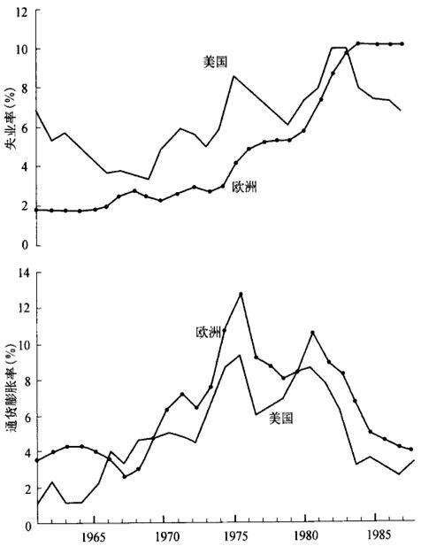 图1.1:1970年代经济危机:美国和欧洲的通货膨胀和失业情况,1960—1987