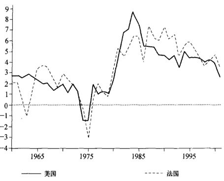图1.5:“沃尔克休克法”:美国和法国的实际利率波动,1960~2001