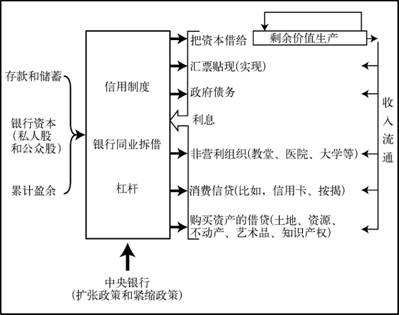 是否存在某种途径,能将马克思关于信用制度作用的一般概念综合进资本主义生产方式内?让我们想象在某种称为信用制度的有限实体内,被银行家、经纪人、货币交易者等人持有的一大笔钱。信用制度的底部是中央银行,中央银行之下是商品货币,特别是金和银。这些商品货币是价值的代表——价值基于世界市场上人类劳动的社会化。马克思假定货币体系是这种垂直的等级制结构。