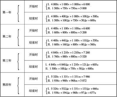 对第II部类,马克思假定了一个不同的追加投资率,在获得的750m中只有150m可用作追加投资。假定价值构成不变,这意味着在原有的1500c和750v之外再购买100c和50v。因此现在总的购买额是1600c和800v,从而生产的剩余价值达到800m,而总产出从年初的3000增加到了3200。这就形成了下一年积累的基础。第II部类年复一年地重复这个过程。