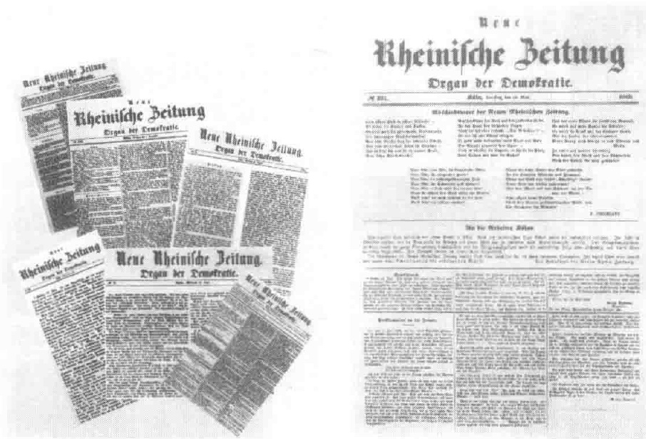 左图为恩格斯和马克思在《新莱茵报》上发表的文章,右图为《新莱茵报》的终刊号