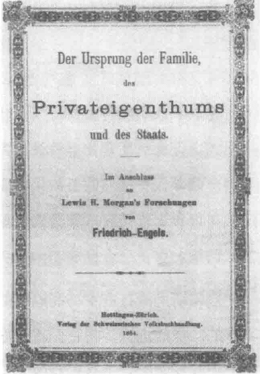 简单来说,恩格斯关于家庭发展的观点如下:婚姻有三种主要形式,大约相当于人类发展的三个主要阶段:在蒙昧时代,是群婚;在野蛮时代,是对偶制婚姻;在文明时代,是以通奸和卖淫为补充的专偶制婚姻。基于摩尔根从血缘制度中对家庭的原始形式的重构,他假设了一种存在于不受限制的性自由部落里的情况。这种情况随后被血缘家庭取代了,在这里,婚姻集团是按照辈分来划分的。接着就产生了普那路亚家庭,它遵循兄弟姐妹之间通婚的禁制,在一个家庭圈子内部共同拥有丈夫和妻子,然而,妻子的兄弟(和丈夫的姐妹)是被排除在外的。正是这种家庭结构形成了氏族——一个确定的、彼此不能通婚的女性血缘亲属圈子——的基础。在氏族内部,随着血缘亲属之间通婚的禁制越来越具有排他性,群婚引起了对偶制婚姻,然而,这并没有破坏妇女在共产制家庭中至上的地位,或者说仍将她们作为唯一可以识别的母亲而给予最高的敬意,因为“在共产制家户经济中,大多数或全体妇女都属于同一氏族,而男子则来自不同的氏族,这种共产制家户经济是原始时代普遍流行的妇女占统治地位的客观基础”[1]。