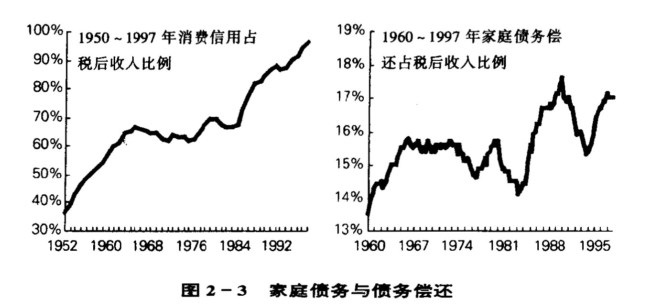 1997年底,美国家庭税后收入的17%(1万亿美元)用来还债,仅比1989年的17.4%低了一点儿(见图2-3,这是联储职员的估计,未正式公布)。这表明,收入的重新分配又大大前进了一步。如果不是利率突然下降的话,这部分债务的比例将会更大。但这段时期的贷款对消费者的需求也是一个很大的刺激。在1950年和1997年间,消费增长的23%来自于消费贷款的增长(不包括抵押)。在1991~1997年间这个数字为29%,高于二战后的任何扩张时期[8]。
