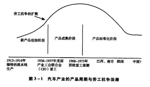 我们在第二章第二节中所描述的汽车产业的发展轨迹,可以被重新概念化为一种产品周期,不过,在这一产品周期中,劳工抗争构成了这一过程中的关键因素。雷蒙德·弗农(Raymond Vernon)1966年最初提出的产品生命周期理论认为,一种创新性产品,其生产往往首先在高收入国家进行,而随着产品经历其“生命周期”,各种生产设备就会越来越向低成本(特别是劳动力成本低廉)的地区转移。在该产品生命周期的早期即“创新”阶段,竞争的压力较小,因此成本相对来说并不那么重要。但随着产品进入“成熟”阶段并最终达到“标准化”,实际的或潜在的竞争对手的数量就会增加,从而降低成本的压力也会随之增加。