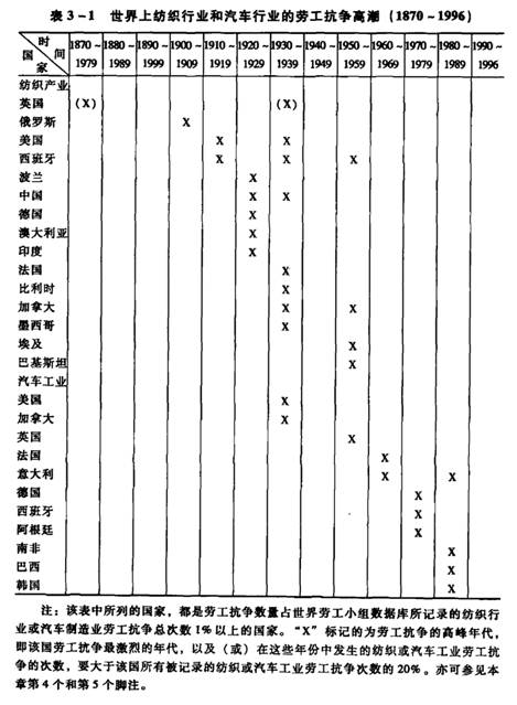 到20世纪20年代,机械化纺织生产的全球化致使全球范围内的竞争加剧。和20世纪70年代的汽车生产商在面临类似竞争压力时所采取的方法一样,纺织业的制造商们致力于寻求生产过程的合理化,并降低生产成本,这些手段反过来引发了20世纪20年代和30年代期间全球范围的纺织工人劳工抗争的主要浪潮。和汽车产业一样,响应这些生产的理性化措施的激烈劳资冲突兴起于产品周期的成熟阶段。不过,纺织行业中所发生的更广泛的生产扩张,其所引发的劳资冲突也更为普遍。并且,在20世纪60年代后期和70年代早期,发生于汽车产业产品周期成熟阶段末期的劳工抗争现象,主要集中于核心地区(西欧),而纺织工业成熟期的终结,却是以20世纪20年代和30年代全球范围的劳工抗争作为标志的。大规模纺织工人罢工的地点遍布于曼彻斯特、孟买、加斯通里亚(位于美国北卡罗来纳州)以及上海等地(参见表3-1)。