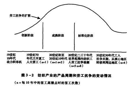 正如20世纪60年代后期和70年代早期的罢工浪潮标志着汽车工业成熟期的结束一样,纺织行业成熟期的终结,与发生于20世纪20年代和30年代世界范围的纺织工人劳动抗争浪潮是一致的。这两个行业成熟期的结束,都以劳工运动激进程度的增强和资本家之间竞争的加剧为标志,这导致了企业家们全力实施空间调整和技术调整策略,并导致了各种矛盾的结果。一方面,产品周期标准化阶段的空间调整策略导致了生产的进一步扩散,另一方面,该阶段的技术调整所引入的广泛的自动化生产方式,使高工资生产地区的竞争力在部分程度上得到恢复。[10]