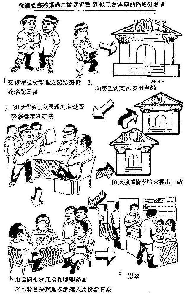 投票前五天,劳工就业部的代表必须在工厂内张贴有选举权的工人名单,选举的日期、时间和竞选的工会或联盟。