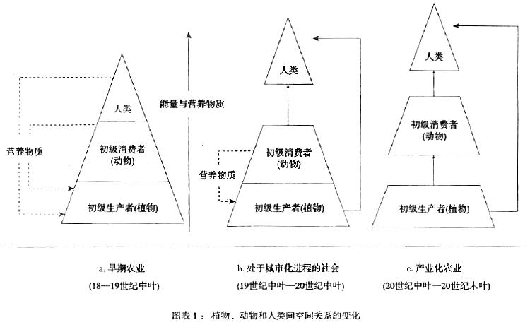 随着资本主义发展进入20世纪,安德森、李比希、马克思、考茨基和列宁所关注的问题日趋集中于一处。农业机械化和农产品价格降低,迫使人们离开农场,他们开始集中在城市,然后则是在城郊社区里成为工人。在该世纪中,城市工业部类,然后是城市—城郊服务部类,再晚一些则是政府部门持续增长的就业机会给先前的农业家庭提供了就业渠道。(另一方面,大多数的第三世界国家在城市化过程中却没有相应增长的就业机会)。随着越来越多的人口离开农场,土壤养分循环的断裂也比19世纪更加彻底。这种养分回流土地过程中产生的断裂如图表1所示。