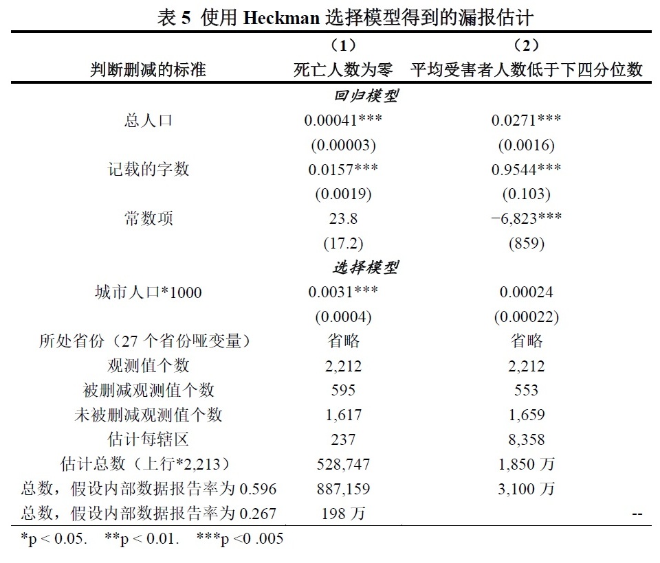 表5记录了死亡(第1列)和受害人(第2列)的估计数。死亡人数的模型采用最保守的标准来确定哪些记录“遭到删减”——从公开出版的地方志中挑出那些记录死亡人数为零的。从第二阶段估计中去掉这些死亡人数为零的记载,本质上是将其视为丢失数据,并在第二阶段的估计中除去它们。第一阶段的结果模拟的是记载死亡人数为零的概率,这将同时被用来调整第二阶段的系数。在第一阶段的回归方程中,我们指定省份和行政区的总城市人口数作为预测记载死亡人数为零的指征。这么做的理由是地方志的字数和详细程度有着广泛的省际差异(前文有详细讨论),而更城市化的地区有更多的资源来编纂地方志。第二阶段的估计预测地方志记载的死亡人数,是该地区总人口数和地方志中用来描述这一时期的字数的函数。