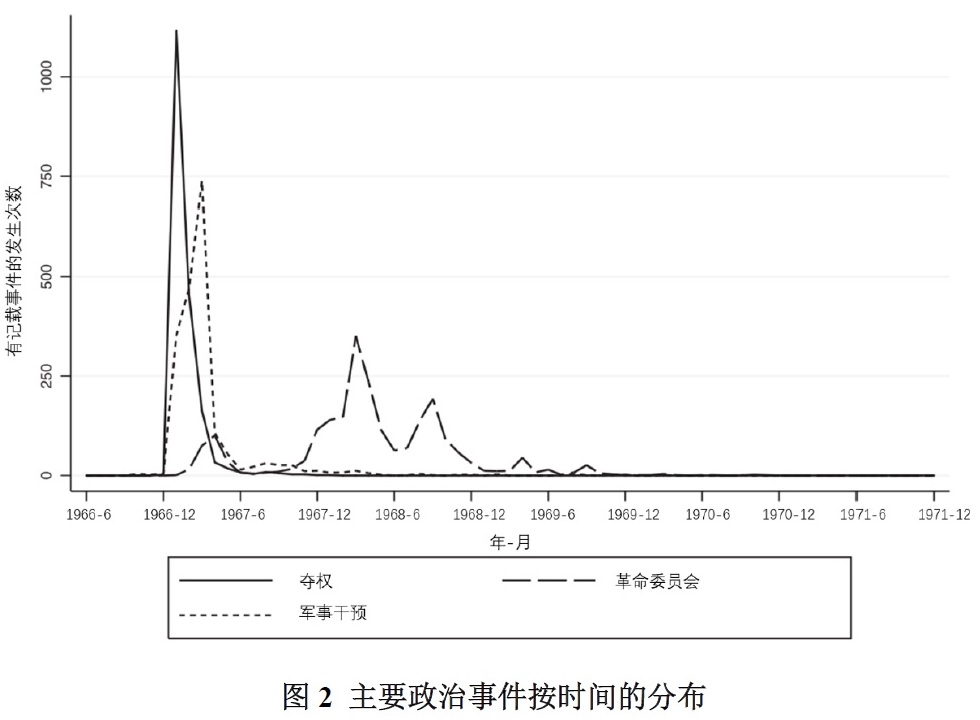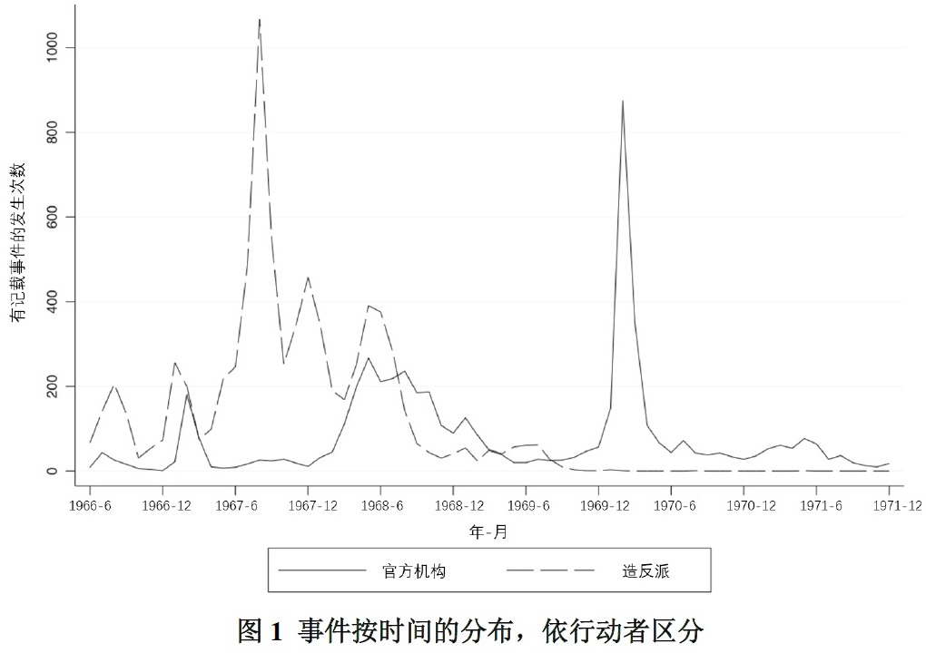 这些事件的时间分布反映了大规模造反运动的跌宕起伏,这场动乱最终被大范围镇压。图1把事件分成了明确的造反派活动和官方机构活动,并描述了二者的时间分布。造反活动在1966年后期迅速发展,出现了几次高峰,之后在1967年中期逐步减弱。出现于1966年8月的第一次高峰和学生造反的兴起相重合,最终将矛头导向了地方政府。1967年早期的第二次高峰标志着造反派攻击的高潮,造反派在夺权活动中推翻了地方政府。最高的峰值出现在1967年夏天,此时造反派不同派系之间的武斗达到高潮;之后冲突逐渐减弱,并在1968年春天之后陡降。这个模式证实了已有的对文化大革命这一阶段的历史记录,这些历史记录将1967年夏天描述成造反活动最为暴力的时期。