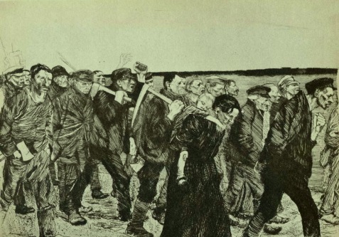 珂勒惠支,组画《织工的反抗》第4幅,《织工的游行》。线形蚀刻,砂纸打磨。(来自维基共享资源(wikimedia commons))