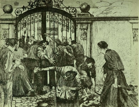 珂勒惠支,组画《织工的反抗》第5幅,《风暴之门》。线形蚀刻,砂纸打磨。(来自维基共享资源(wikimedia commons))