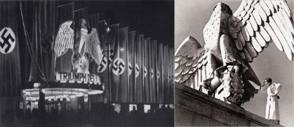 纳粹利用和发展了工人运动的图像象征(红旗、大规模游行)并将其提升到一个新的水平。这与莱妮·里芬斯塔尔(Leni Riefenstahl) 1935 年的纪录片《意志的胜利》(Triumph of the Will)中的电影合流,该纪录片记录了1935 年的纽伦堡集会。
