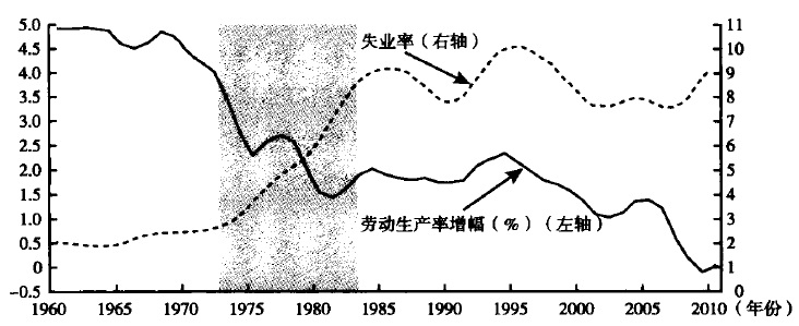 图9 -1 1960 -2010年法国的劳动生产率增幅和失业率