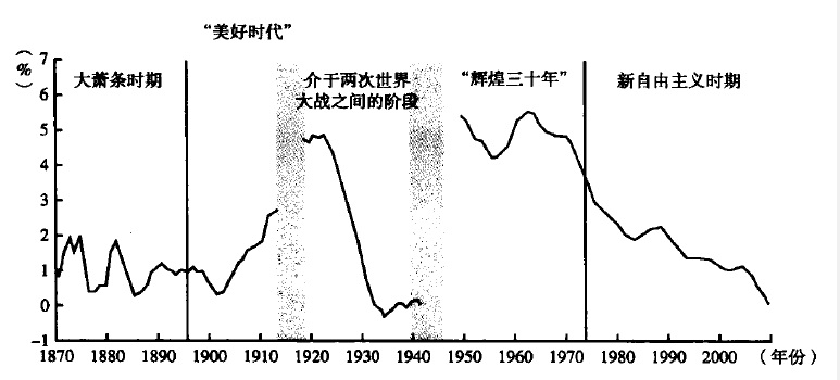 人们可以清楚地看到连续出现的各个不同阶段。 19 世纪最后1/4 的时间 (1873 -1896年)与“大萧条”是相对应的:在此期间,劳动生产率的增长十分低迷。随后而来的是“美好时代” (Belle époque):这一阶段劳动生产率迅速提高,甚至在第一次世界大战爆发后的头几年增长势头仍得到了保持。在两次世界大战之间的阶段,劳动生产率开始下降,并最终导致了20 世纪30年代的大危机。劳动生产率持续下降,这种趋势在第二次世界大战期间继续保持。与战后重建相对应的是劳动生产率的迅速提高,并很快揭开了被称为“辉煌三十年”(1945 -1975年)的序幕:在此期间,劳动生产率的年均增幅达到了5% ,这是历史上从来没有见过的。最后,与 1974年和1975年的经济衰退相对应的正是劳动生产率的下降,这种下降趋势在整个新自由主义阶段——它是自20 世纪80年代开始的——并没有改变。