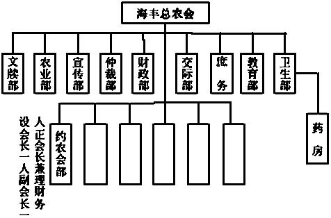此时农会并发出有宣言(须待查检)及农会利益(须带查检),兼之无论何日何夜,我们必到乡村去宣传。到了十月份,加入农会会员每日平均有二十人了。由赤山约而平岗约,银镇约、青湖约、河口约、西河约、公平约、旧墟约……十余约,都成立了约农会,把县城东西南北都包围起来了。这个时候,我们就筹备海丰县总农会。 这个时候,农会就发起组织了一个济丧会,由会员自由加入,约百五十余人,无论那个会员的父母或自己死了,由各会员挪出两毫钱来济丧。此方法宣布后,第一日即有某会员的父亲死了,各会员挪出两毫钱,共约三十余元,同时会友并往致祭,行送丧的礼节,农民益加欢喜。到了第五日,又有会员的父亲死了,这个时候,济丧会的会友无法负担,乃先由农会代出,另日由济丧会筹还。到了第七日,又有一个会员死了,再由农会代出三十元。这个时候,济丧会会员吓了一惊,成立未十天而死者五六人,倘继续下去,如何办法呢?乃开全体会员大会,宣告临时停办,俟农会财政充裕时,始继续办理。 又办了一间农民医药房,在海丰大街,由一热心农民运动之西医生某君担任医生,凡农会会员有病须药者,准由该会员执会员证到来领药,药价仅收一半,非会员则全收。请诊症者如遇会员,不取诊费。并由该西医之老婆担任接生,凡遇会员不收接生费,仅取药费一半,大约二三角钱。自是领药接生者甚众。甚至有非会员而借会员证去领药者亦有之,乃在会员证中加数条规则以限制非会员借用,并规定会员证失落补领费二毫。 到了民国十二年,新历一月一日,乃海丰总农会成立大会,此时加入会员已达二万家户,以农会管辖下之人口计,有十万人[6],以全县人口比较,占全县人口四分之一。是日各乡代表到者共六十余人。开会秩序:(一)主席宣布开会理由,(二)各代表报告,(三)主席报告筹备经过,(四)演说,(五)选举,(六)讨论章程,(七)提议,(八)欢宴。结果选出彭湃为正会长,杨其珊为副会长,蓝镜清为财政,林沛为庶务,张妈安为调查……(其余忘记)。总农会之组织图表如下: