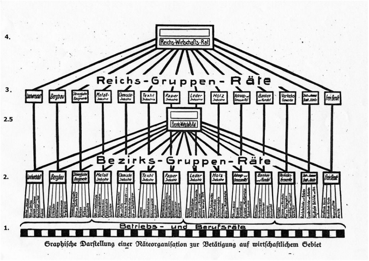 这个示意图的基础,是第1层的企业苏维埃(Betriebsräte),它们是大型工厂的代表;与专业苏维埃(Berufsräte),它们代表自由职业者与小型企业——几家小单位合并成一个小企业,以便选出自己的苏维埃代表。专业苏维埃代表的是由从事相同专业的几家小单位构成的一个团体,而不只是一家单位。