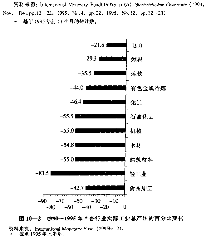 表10—1和图10—2显示了俄罗斯11个工业生产部门的产出情况。如图10—2所示,在1992—1995年实施休克疗法期间,各部门的产量都大幅度地下降了[6],只有电力和燃料部门的下降幅度低于1/3,包括纺织、服装和皮革制品在内的轻工业部门下降幅度最为严重[7],如表10—1所示,在1995年,四个金属和化工部门终于开始增长,而燃料部门差不多也止住了衰退。