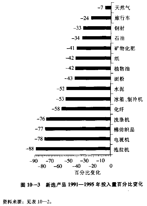 可得到的单个工业品的数椐表明,在1991—1995年期间,没有一种主要产品的产量是增长的。[8]图10—3列出了生产品和消费品实物产量下降的百分数,数据按四年间下降幅度从最小到最大顺序排列。注意,图10—3中作为消费必需品的两种食品——菜油和面粉的产量下降了40%。只有天然气的下降幅度不大,只下降了7%。表10—2表明,只是在实施休克疗法的第四年,即1995年,部分样本产品产量才出现增长(包括天然气、钢铁、矿物肥料、纸张、化学纤维和尼龙)。